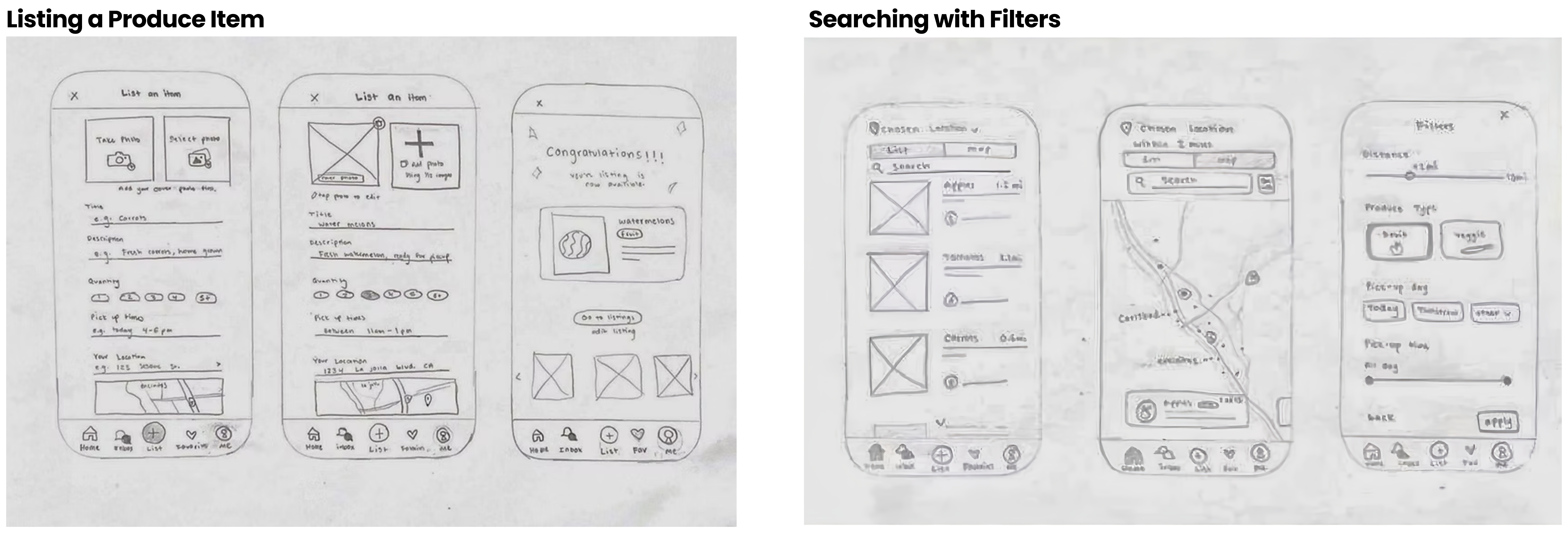We then created paper prototypes based on our wireframe sketches to simulate the on-screen interactions. The prototypes then are used for think aloud user testing. This allowed us to rapidly iterate, and gather early user feedback. Below is the paper prototype for "Listing a produce" and "Searching with Filter".