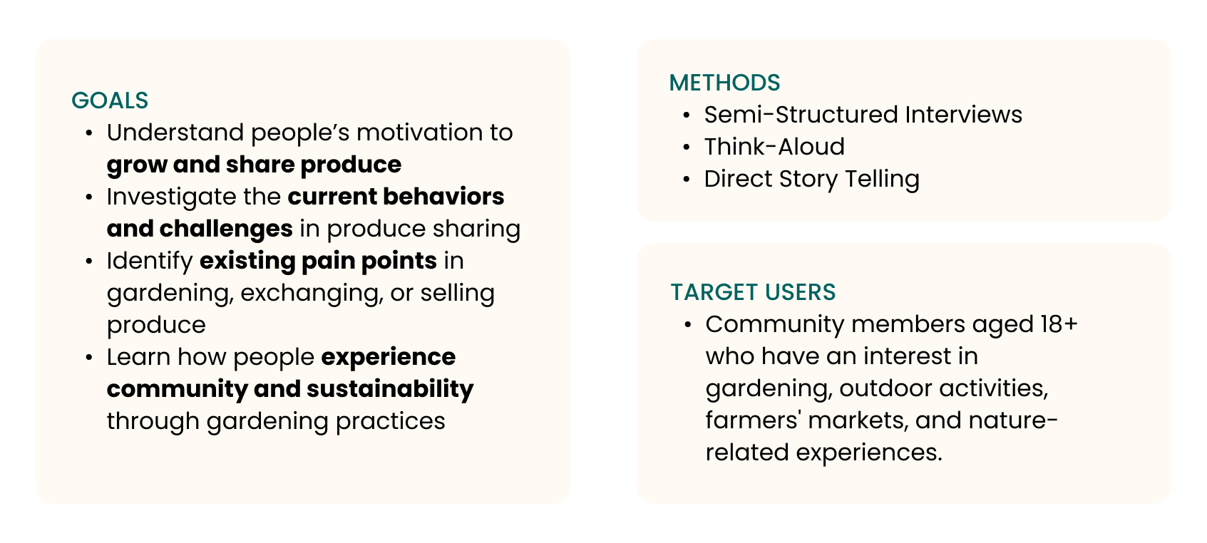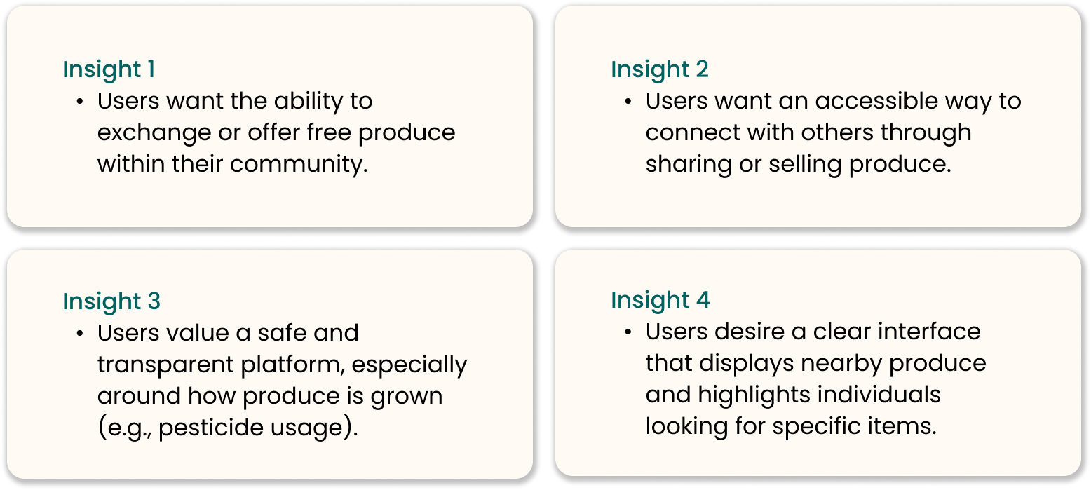 We began with some exploratory qualitative research into this problem space. We wanted to understand about people's experiences with sharing, buying and selling produce.