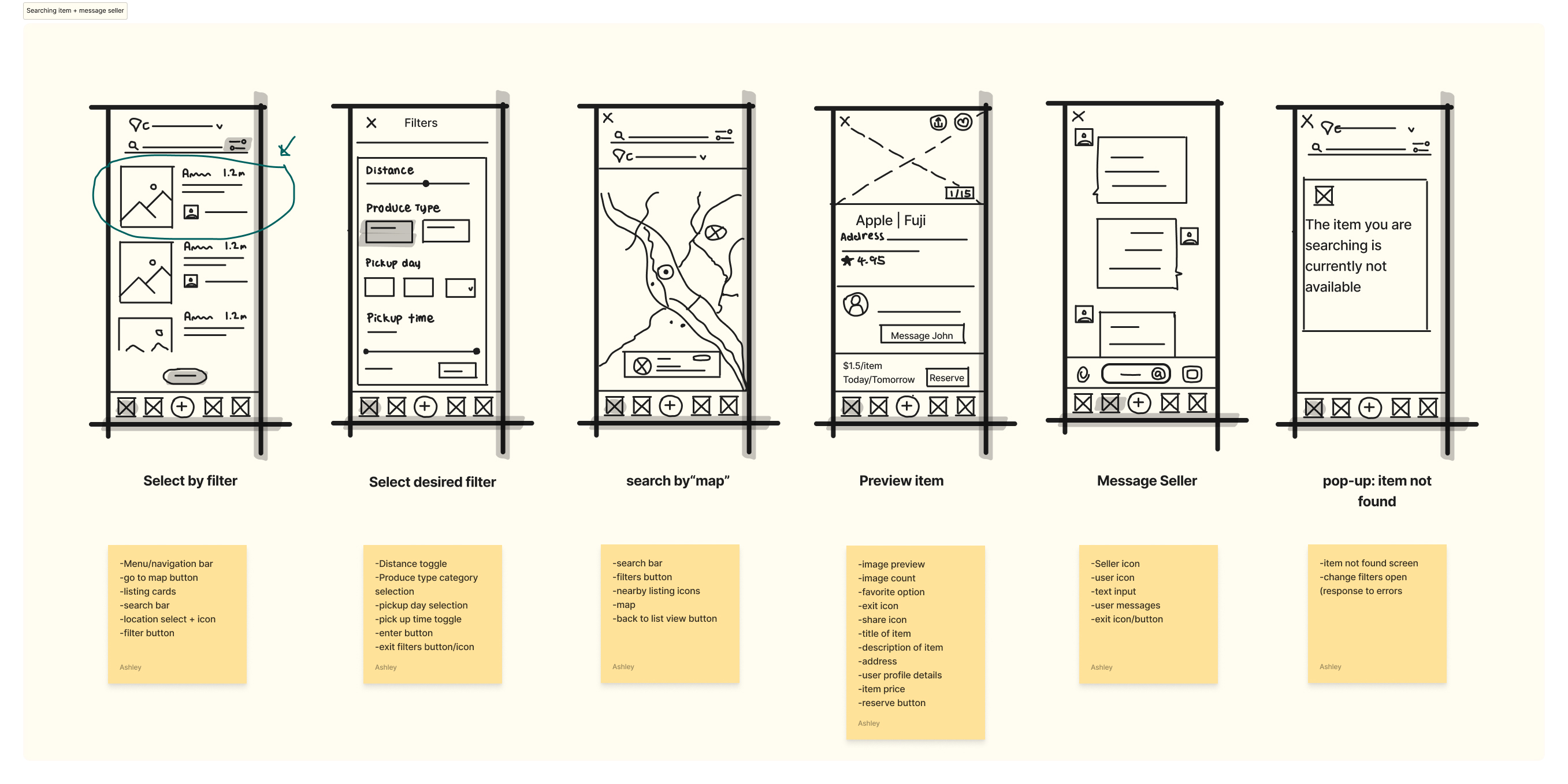After we decided the main flow and overall structure, we divided the experience into four major sections based on the user flows. Below are the wireframes I created for the "Searching Item + Message Seller" and "Add Listing Flow".